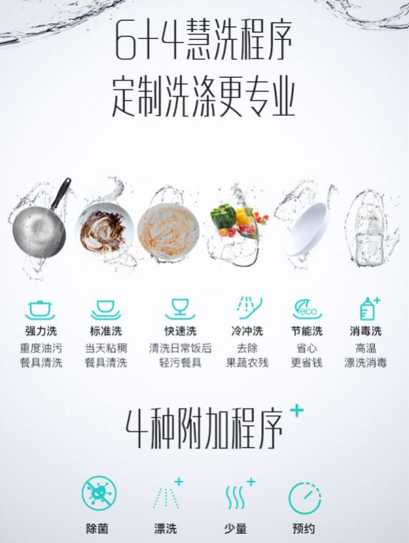华帝洗碗机E3系列配置了6+4多种定制洗涤程序,包括强力洗、标准洗、快速洗、冷冲洗、节能洗、消毒洗等6种标准洗涤程序,同时加配了除菌、漂洗、少量和预约洗这4种特色洗涤程序。