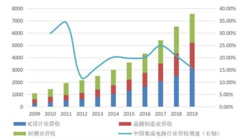 2019 年,中国集成电路产业销售收入为7,562.3亿元,同比增长15.80%,其中集成电路设计业销售收入为3,063.5 亿元,同比增长21.6%,占总值40.5%;晶圆制造业销售收入为2,149.1 亿元,同比增长18.20%,占总值的28.40%;封测业销售收入为2,349.7 亿元,同比增长7.10%,占总值的31.1%。