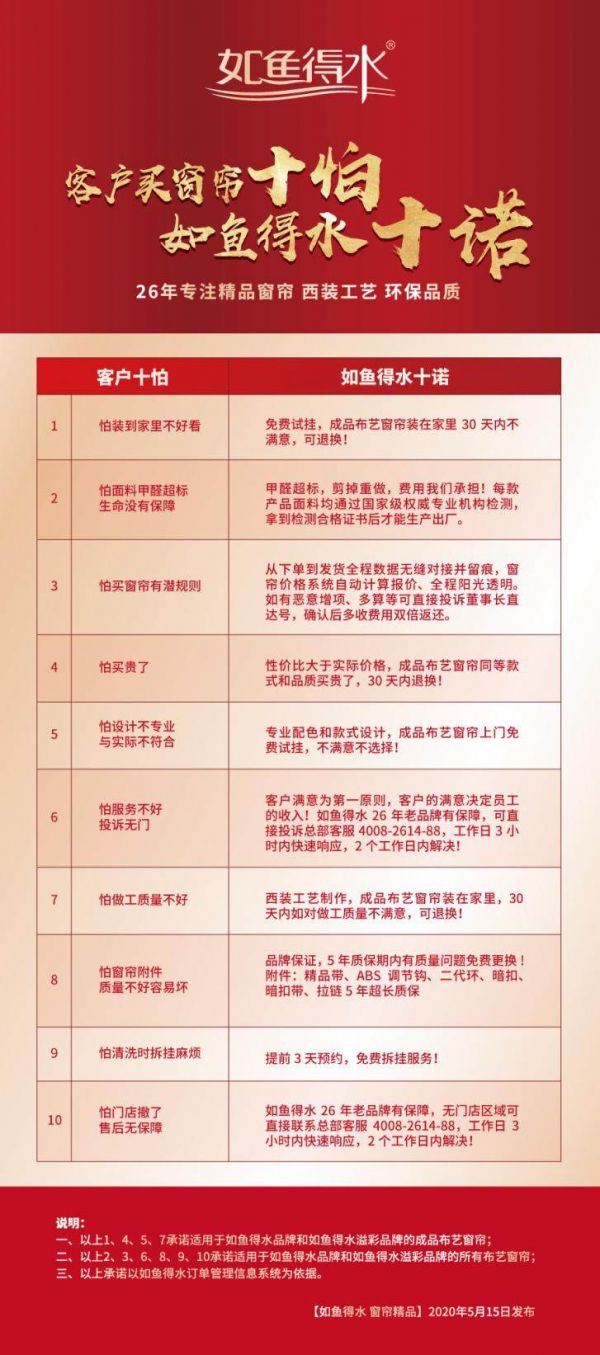 没有调查就没有发言权。在进行了大量的市场调研后,如鱼得水获得了海量一手数据。怀抱着领跑窗帘行业发展的理想与信念,2020年5月15日,如鱼得水窗帘精品郑重发布“客户买窗帘十怕,如鱼得水十诺”,迅速掀起市场狂澜。
