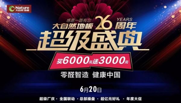 为感谢广大消费者多年来的陪伴同行,大自然地板举办26周年超级盛典,有扫码转发赢精美好礼、全民带货送厨房地板、抢免单大奖、购庆典爆款等多重优惠。并且,即日起至2020年6月20日,买地板满6000元送3000元豪礼。