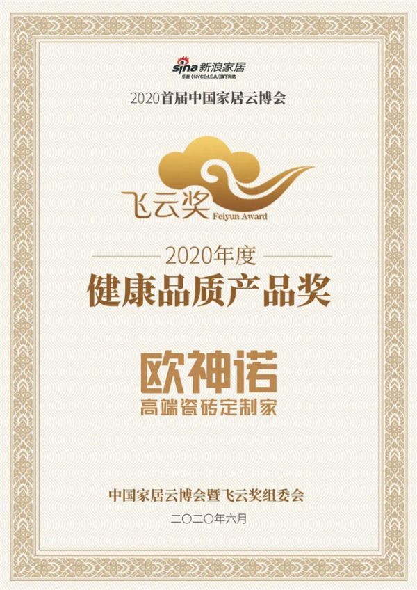 自欧神诺抗菌砖在5月25日直播官宣上市以来,打破了瓷砖的固有印象,掀起了新时代功能瓷砖的热议,其中有质疑,但更多的是惊叹,欣赏与期待。就在10号,凭借其卓越的抗菌性能和过硬的研发实力,欧神诺抗菌砖荣获飞云奖2020年度【健康品质产品奖】。