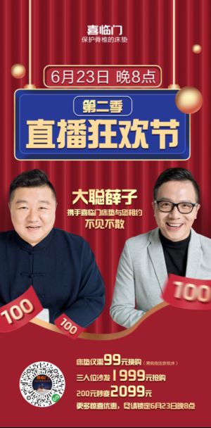 6月喜临门年中大促全国启动,为更好助力品牌和门店销售,深度打通区域线上线下营销,南京喜临门联动百万级大咖网红,携手放送钜惠直播福利。2020年6月23日晚8点,喜临门与“大聪薛子”联动直播秀准时引爆。作为南京当地的知名电台主播,“大聪薛子”给大家带来了很多欢声和笑语,是当地知名度非常高的主播。本次直播,南京喜临门联动位于红星美凯龙卡子门店一楼,联袂商场为消费者推出多重福利,防螨护脊床垫仅需99元换购,三人位沙发仅需1999元换购,当晚更有工厂10万现金补贴!