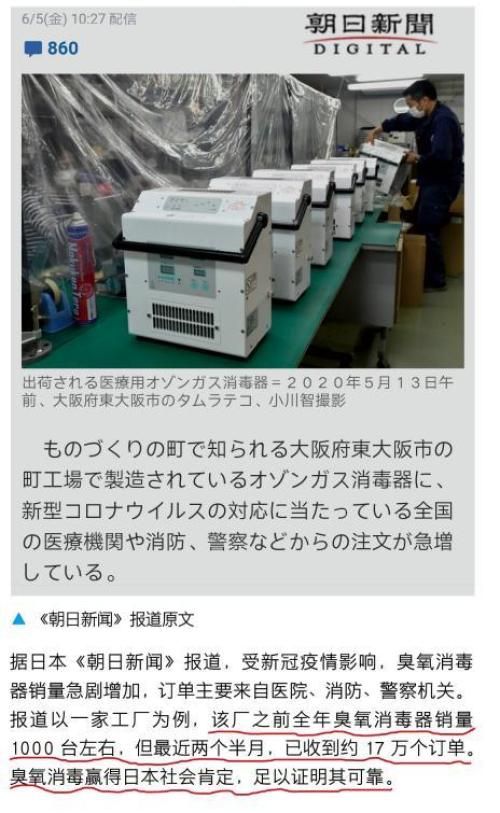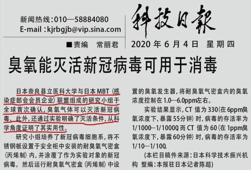 6月4日,中央主流新闻媒体《科技日报》刊登重磅报道:臭氧能灭活新冠病毒可用于消毒。报道主要内容如下:日本奈良县立医科大学与日本MBT(感染症部会会员企业)联盟组成的研究小组于全球首 次确认,臭氧气体可以灭活新冠病毒。此外,还通过实验明确了灭活条件,从科学角度证明了其实用性。