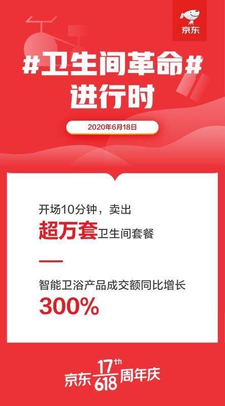 卫生间是消费者关注度增长最快的居家空间,年轻人更愿意为卫生间花钱,并在里面停留越来越长的时间。这反映出,卫生间格调已成为反映人们经济条件、审美水准、生活态度的重要参照。京东618开场10分钟,卖出超万套卫生间套餐,智能卫浴产品成交额同比增长300%。