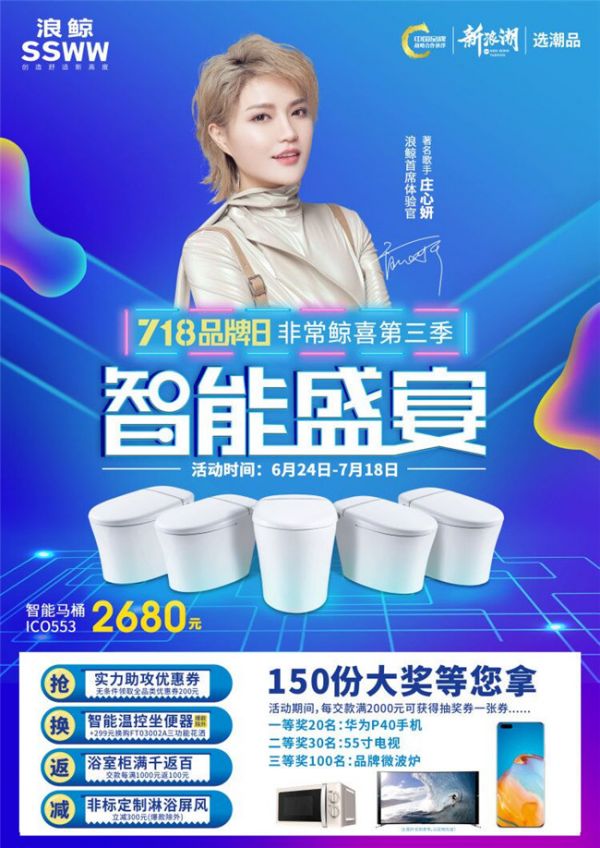 浪鲸卫浴2020年718品牌日非常鲸喜第三季即将来袭!6月24日至7月18日,不仅可以享受一系列由浪鲸卫浴提供的鲸喜福利,届时,还有浪鲸首席体验官——著名歌手庄心妍为你推荐高颜优质的卫浴产品。