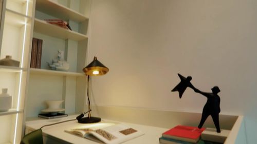 书桌摆放在客厅,与沙发相连。两人在办公、休闲时既相互独立,又能时刻保持互动,为女主人量身定制的书架能收纳大量书籍和小摆件。