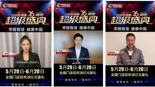 此次大自然地板26周年超级盛典,亮点颇多。众多明星、设计师、媒体朋友、家居行业头部品牌为大自然家居送上精心录制的祝福VCR。