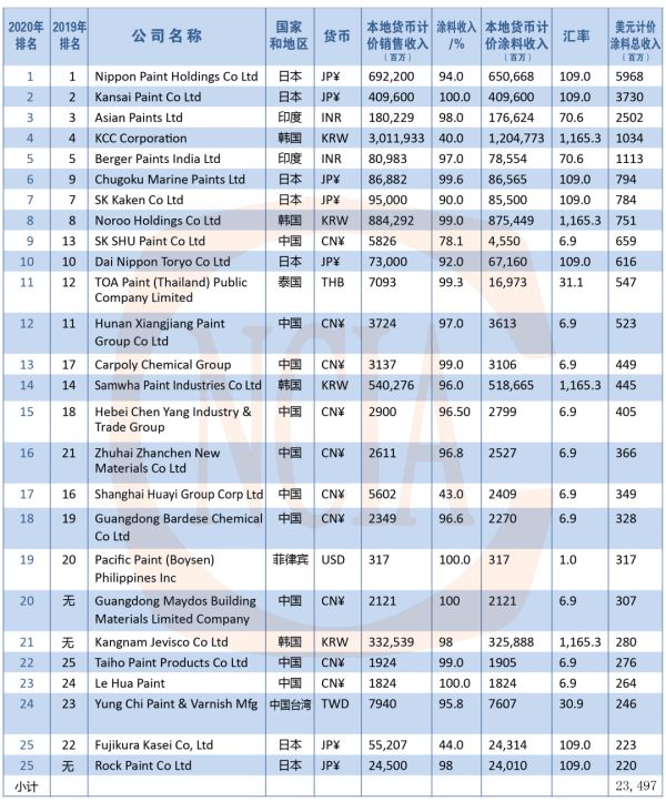 2020亚太地区涂料生产商榜单出炉,三棵树位列中国涂料第一