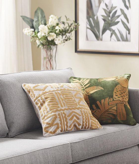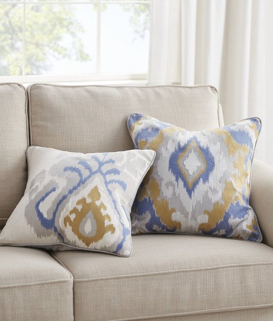 Harbor House 春夏新推出了Esmay Ikat 系列靠垫套,采用了时下流行的Ikat花型。放弃扎染工艺,转而用精湛的绣花工艺,呈现Ikat的渐变效果。蓝色、金棕色点缀其中,异域风情浓郁,在灰色系沙发的百搭视觉中令家更出彩。