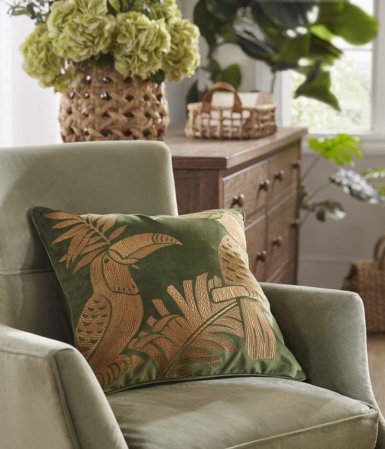 一边是湛蓝海洋,一边是棕榈山峦,于是,山峦间的趣味托哥巨嘴鸟与灵动棕榈叶,化为了Harbor House Papua 绒布绣花靠垫套上的灵感。丛林绿、麦穗金,精湛的绣花带来的特殊光泽感和肌理感,闪耀自然生命力。