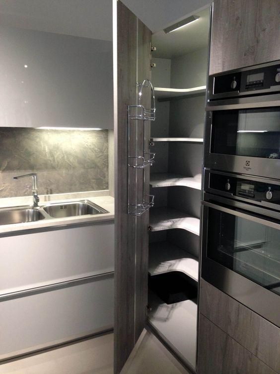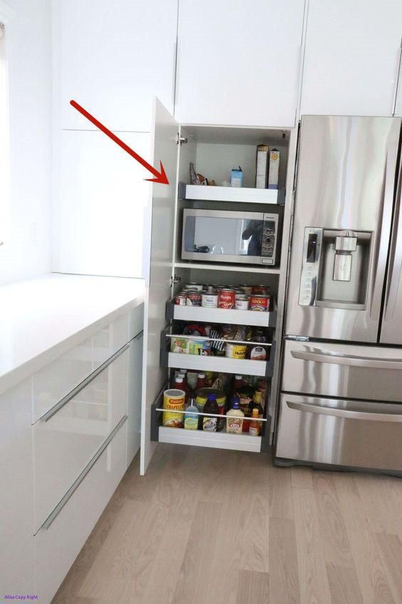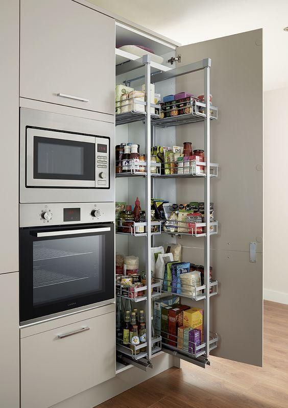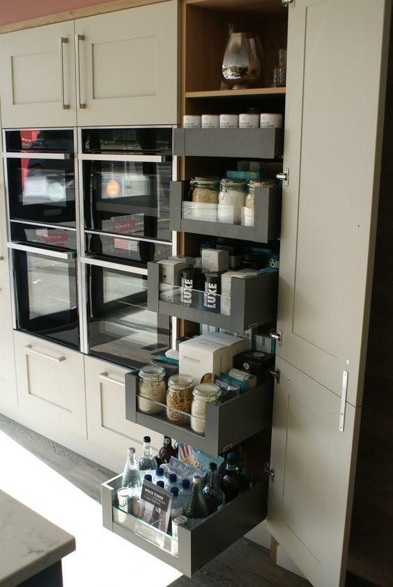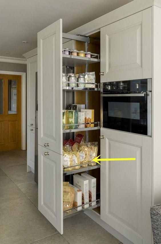 可以选择滑轨或带滑轮的柜子,将它嵌入这20公分宽的空间里,这样我们可以从侧面拿取或收纳厨房用品,能够做多层柜子,同样让厨房收纳能力翻倍。