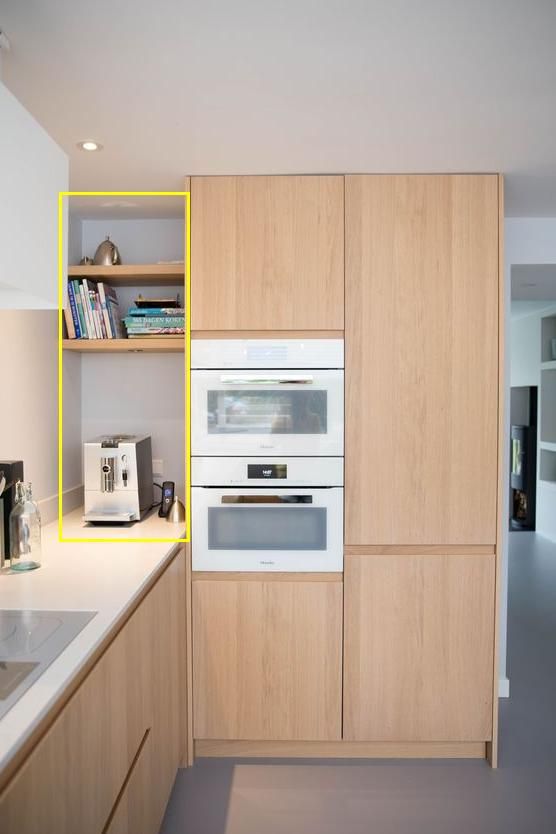 当下流行将厨电嵌入柜体里,不占台面空间,但嵌入电器旁与墙体间还空有20cm宽,设计师说:必须做收纳柜,安排!