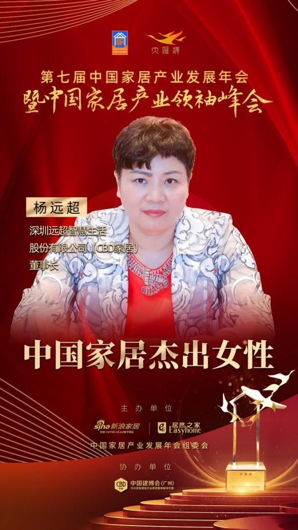 深圳远超智慧生活股份有限公司(CBD家居)董事长杨远超,荣获2020年「大雁奖」中国家居杰出女性奖。