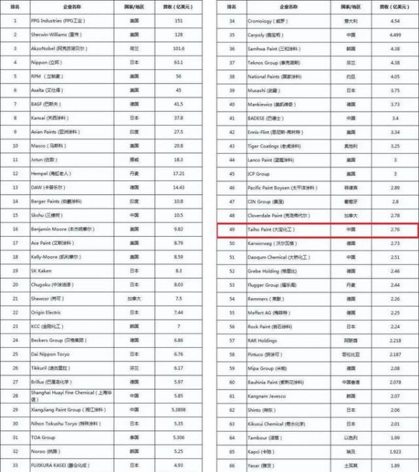 美国《涂料世界》自2010年开始,已经连续第11次发布该榜单。其中,中国有8家涂料企业跻身榜单。《涂料世界》是全球涂料行业最具权威性的杂志之一,因其专业性和严谨性在业内获得广泛赞誉和认可,被评为“最有阅读价值的涵盖涂料和胶粘剂行业的研究杂志”。《涂料世界》每年所做的全球涂料企业排行榜是唯一关于油漆涂料制造商的全球性排名报告,堪称全球涂料行业的晴雨表,在业内具有相当的可信度和参考价值。