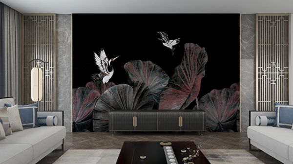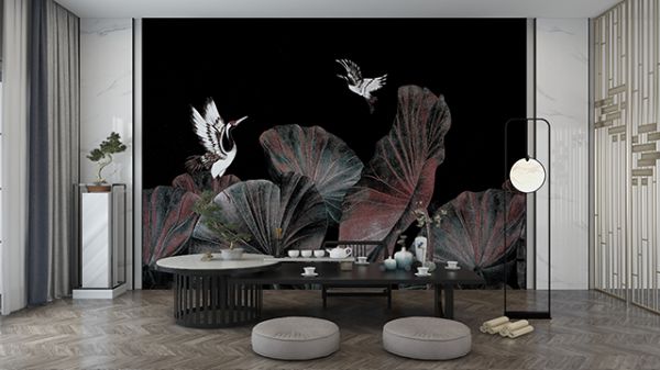 “碧荷生幽泉,朝日艳且鲜。”古典绿是荷叶的本色,在霞光的照耀下,又添了一抹旖旎的的沙漠红。摇曳的荷影之上,白鹤迎风而来,随处而歇,展翅引颈的样子,自由而安宁。“鹤”、“荷”与“合”谐音,寓意家中和和美美。