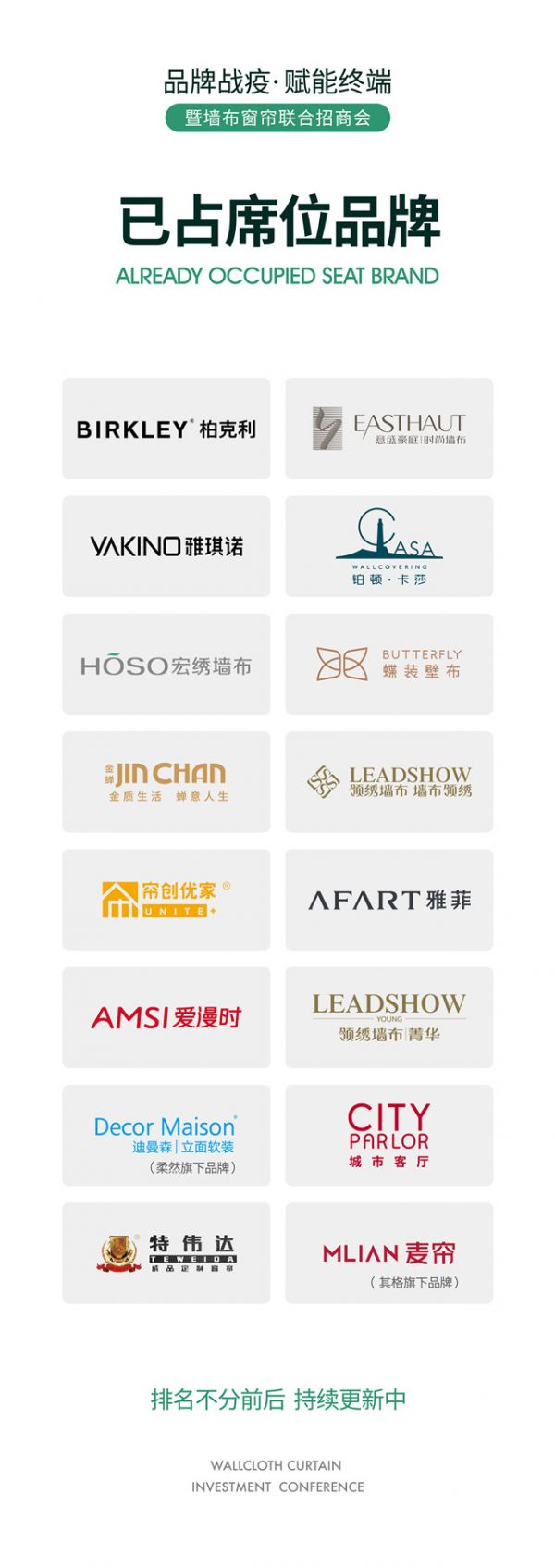 2020年7月13日,品牌战“疫”赋能终端——墙布窗帘联盟招商启动会在中国轻纺城窗帘布艺协会基地成功召开。本次招商启动会,就2020年夏季窗帘墙布柯桥展进行预热招商,中国轻纺城窗帘布艺协会会长赵君会、绍兴佰圣教育信息咨询有限公司总经理黄东阳、项目总负责施建良、布道文化总经理李宏伟、各实力品牌企业负责人出席,多家企业特训人员参加。
