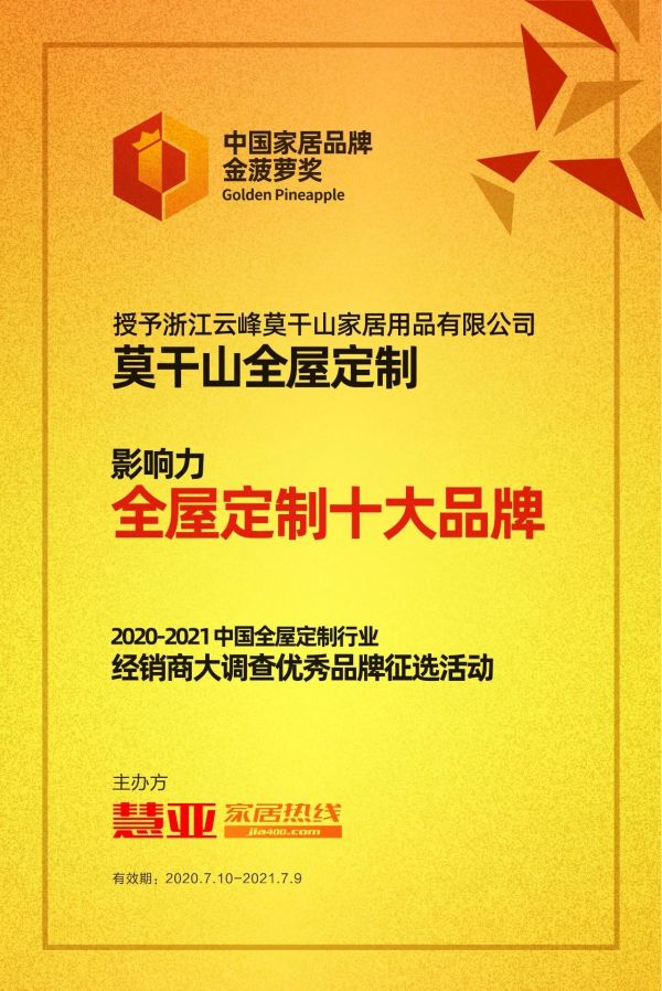 莫干山全屋定制,凭借其过硬的产品质量,丰富的产品品类,还有优质的服务团队,荣获了“2020-2021中国全屋定制行业影响力十大品牌”荣誉。