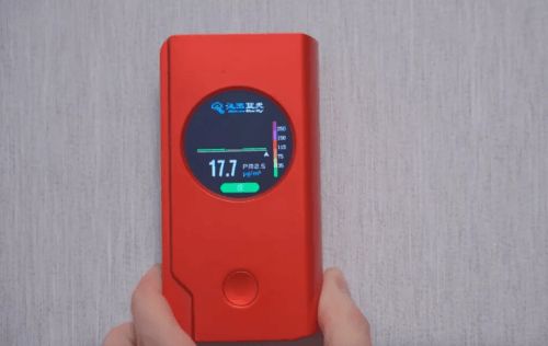 测评开始前,为了营造高污染环境,专门安排了一位工作人员在书房吸烟,随着工作人员的“吞云吐雾”,PM2.5测试仪器上的数值也逐渐升高,最后达到了999μg/m³,这意味着最多只能显示三位数的仪器达爆表状态,空气呈严重污染状态。