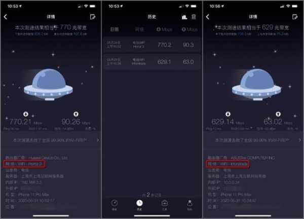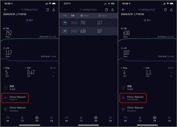 荣耀路由3的网速究竟如何?首先,荣耀路由3内部是华为自研的凌霄650+和麒麟W650芯片,这两款芯片能够支持160MHz带宽以及2.4Gbps超高峰值速率。上图左边为荣耀路由3的wifi6+测试结果,右边为wifi5路由器的测试结果。对比可见,手机在荣耀路由3的wifi6+网络环境中下载速率可以达到752Mbps,上传117Mbps,较之wifi5路由器的速度数据可以看出有着明显差距。再根据网速测试APP“测网速”的数据表明,左边的荣耀路由3的下载速率荣耀路由3达到了770Mbps,而右边的wifi5路由器只有630Mbps左右。上传速率荣耀路由3更比wifi5路由器快了近50%。