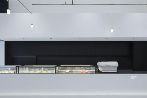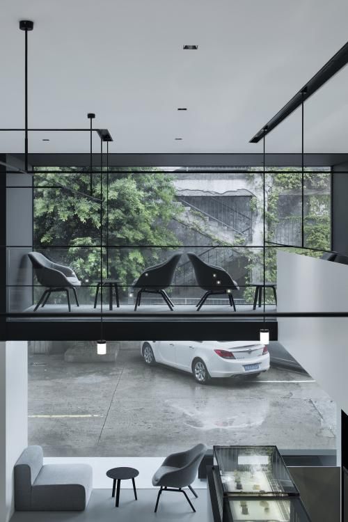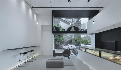 店铺整体布局以黑白灰为主,主空间由3个完整的黑、白、灰盒子组成,黑色沉稳、白色舒爽、凹陷的灰色客座区自带故事属性,结构穿插,颜色变幻,不仅仅增加空间的层次感,也使得人的视觉落脚点随移动而变化,妙趣横生。