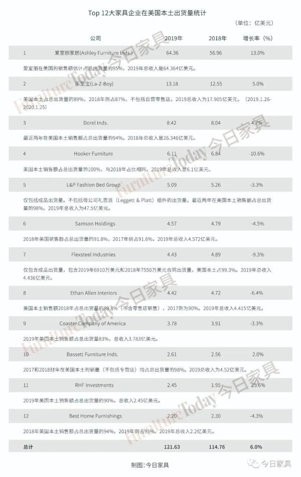 美国TOP12家具企业总出货量121亿美元,最高增长达25%