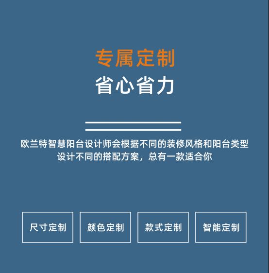 阳台有什么用处?晾衣?闲置?堆放杂物?传统的阳台早已不能满足我们的生活所需,欧兰特“智慧阳台”是立足于解决用户日常家居生活使用空间的痛点,打造小孩的儿童娱乐房、妈妈的晾衣间、爸爸的茶室、全家人的休闲花园等多元化空间设计布局,为阳台空间解锁无限可能,一站式为消费者定制专属自己个人的理想生活方式!