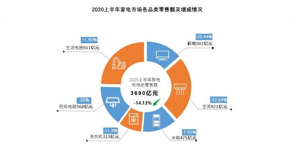 近两年来,我国家电市场一直处于萎缩态势,疫情的爆发更是令本就处于需求收窄、产业调整期的家电市场雪上加霜。据《报告》介绍,2020上半年,我国家电市场零售额规模同比下降14.13%,跌幅高于我国社会消费品平均水平2.73个百分点。