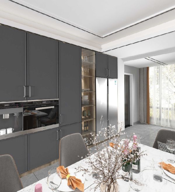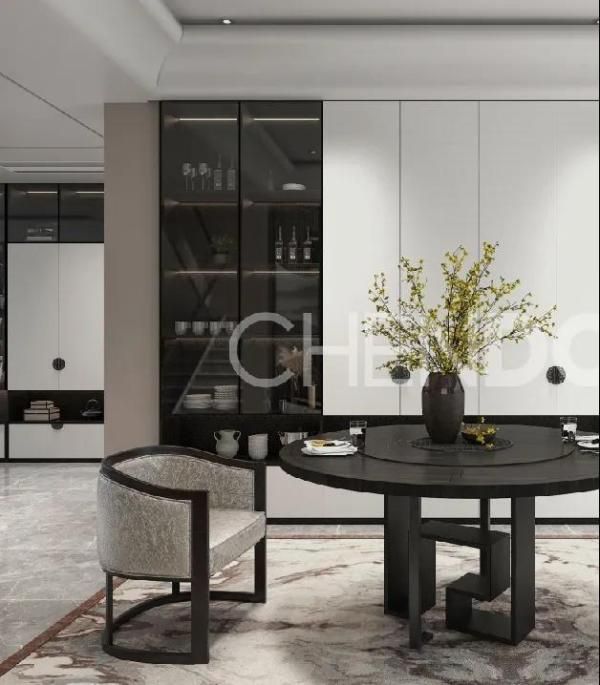 通过一个合理的过渡使客餐厅一体化,让两个功能区既和谐又独立。