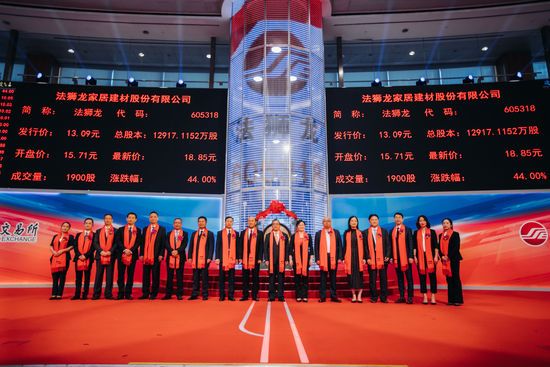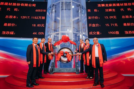 8月3日上午,随着上海证券交易所一声清脆的铜锣声,法狮龙家居建材股份有限公司,首次公开发行A股在上交所正式挂牌上市,股票简称“法狮龙”,股票代码“605318”,法狮龙成为海盐县首家登陆A股的上市公司。