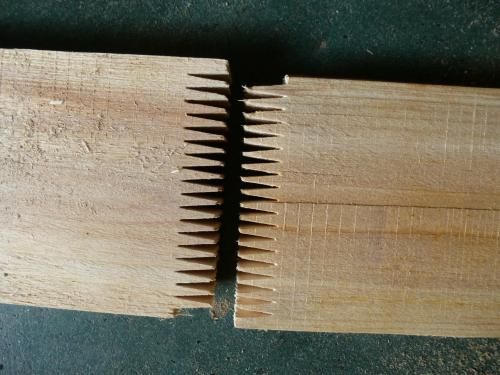 实木指接板采用单层实木材料制造,将各种实木材料锯成小块,然后进行深度烘干再将小块开齿,在开齿部位和小块侧面涂刷脲醛树脂胶粘剂,通过挤压固定。