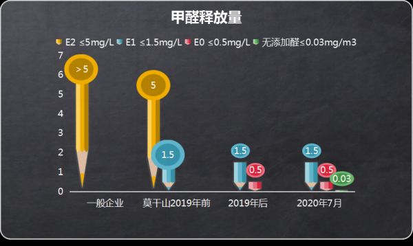 科技木生产过程中一道重要的工序就是胶压,目前行业普遍使用的是脲醛树脂胶黏剂,不可避免地会释放出游离甲醛,这是科技木行业的一大痛点。莫干山科技木作为行业领导者,通过不断的技术革新,在行业内率先实现E1级(≤1.5mg/L)产品全覆盖,特殊定制产品,能达到E0级(≤0.5mg/L)。