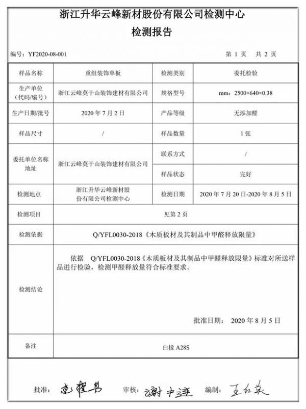 莫干山科技木为了打造无醛健康产品,成立以云峰莫干山家居研究院副院长、教授级高工庞小仁为主导的“无醛科技木开发项目”。科研团队根据科技木工艺特点,创新无醛胶黏剂,并联合中国林科院木材工业研究所、中国科学院宁波材料技术与工程研究所、浙江农林大学等科研院校共同攻克关键核心工艺技术。经过近2年的科技攻关,终于在2020年7月,第一张无醛科技木皮在莫干山诞生,标志着莫干山科技木产品体系开启了装饰建材领域无醛空间,引领行业迈向环保新高度。经莫干山家居研究院检测,甲醛释放量0.025mg/m³(干燥器法检测结果为0.1mg/L),满足T-CNFPIA 3002-2018《无醛人造板及其制品》标准的要求。