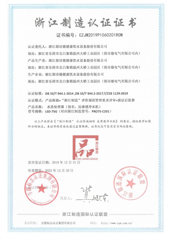 2020年初始,浙江朗诗德健康饮水设备股份有限公司便顺利通过“浙江制造”认证,并获得《浙江制造认证证书》。成为国内首批通过反渗透净水机产品“浙江制造”认证的企业。
