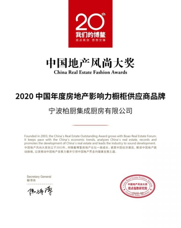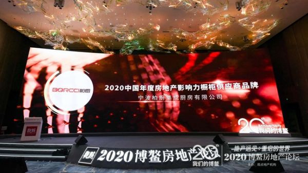 在2020中国地产风尚大奖颁奖盛典现场,宁波柏厨集成厨房有限公司凭借过去一年的努力,荣获“2020中国年度房地产影响力橱柜供应商品牌”。在全国众多主流媒体、研究机构、地产开发企业、投资机构、金融投行及专业机构的共同见证下摘得荣誉。
