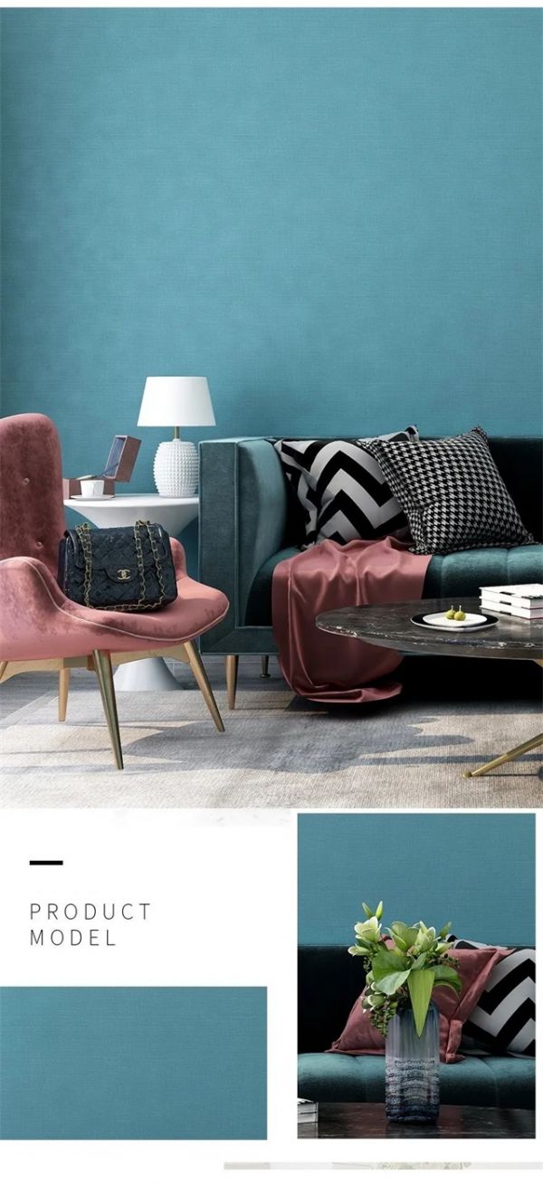 雅诗澜用这款湖蓝色墙布作为空间主色调,带有格纹和其他线条图案的靠枕搭配同色系的沙发,统一了客厅的风格。大面积湖蓝色与灰色相对应,无形中增强了视觉效果。