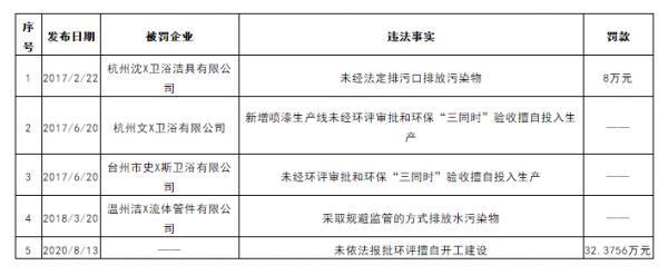 据浙江省生态环境厅发布的《浙江省环境违法黑名单信息汇总表》,从2017年至今,浙江省至少有5家卫浴、五金配件企业因为环评被罚。8月13日发布的这次环评处罚,罚款累计金额超过30万元,属于近3年浙江省对卫浴企业处罚力度最大的一次。