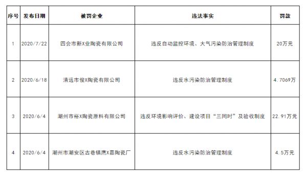 广东:肇庆、清远、潮州4家陶瓷企业被罚52.1万余元