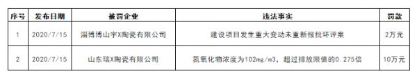 2020年7月15日,山东省淄博市、临沂市的生态环境局共发布了2则陶瓷企业因为环保问题被罚的新闻。