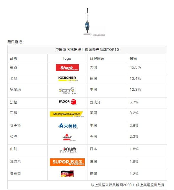 清洁电器在中国市场大致发展出两条路线,一条是以无线吸尘器为代表的吸尘器类,比如手持吸尘器、推杆式吸尘器、扫地机器人、电动扫把等,而另一条路线则是以清洁拖把为主的蒸汽拖把、电动拖把这一新兴品类。据奥维网2020H1线上数据监测,蒸汽拖把类产品以美国科技清洁专家Shark鲨客品牌为主占有大半市场份额,成为大部分家庭炙手可热的明星产品。