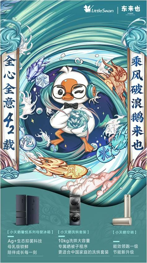 乘风破浪的“鹅小天”形象,让历史悠久的国民品牌“潮”起来。这一IP不仅是通过生动的形象呈现小天鹅带来的健康、洁净生活方式,更是和追求高品质生活的年轻一代的隔空对话,与更多中国家庭探索中国式健康新生活。