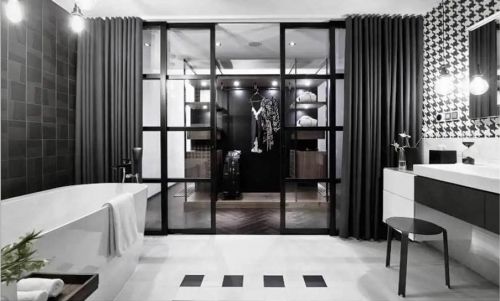 步入古典之境与艺术之域,就连其中浴室也风格显著。KLUDI BALANCE纯净白色花洒面,与深沉黑色立式龙头,更是组合出奇妙光影美学。
