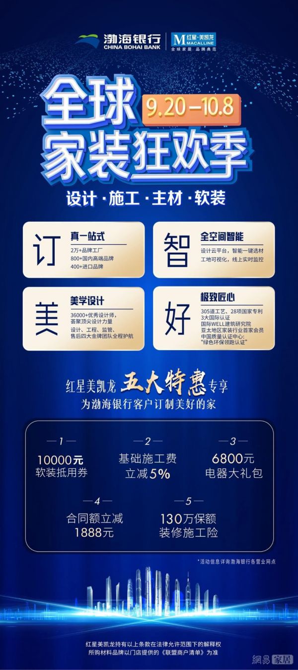 据悉,在刚刚过去的秋季大会中,红星美凯龙首次将家装公开宣布提升为第一业务,而在即将到来的红星美凯龙“全球家装狂欢季”十一大促活动中,双方也将联合为共有客户构建起家装服务、家居惠购等全生命周期置家服务。2020年9月20日—2020年10月08日活动期间,渤海银行渠道客户可获得家装服务叠加福利,专享1888元装修红包与130万保额装修施工险。