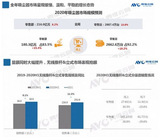 从昔日的冷门家电,到品质生活“标配”,国内吸尘器市场经历了一个快速升温的过程。奥维云网(AVC)推总数据显示,2020H1吸尘器零售额97.1亿元,同比增长7.8%,零售量1216.1万台,同比增长17.8%。其中,线上渠道表现抢眼,零售额81.5亿元,同比增长19.5%,零售量1133.6万台,同比增长24.6%。