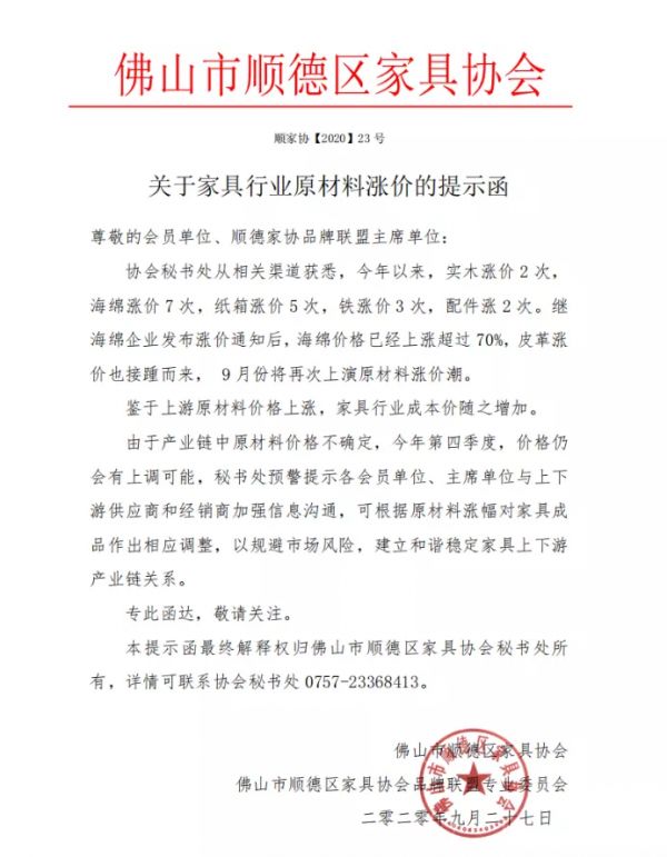 9月27日,记者从顺德家具协会公众号获悉,由于产业链中原材料价格不确定,今年第四季度,价格仍会有上调可能。
