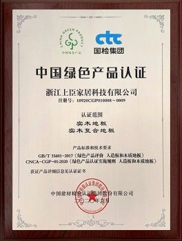 中国绿色产品认证由国务院办公厅、国家市场监管总局、国家认监委共同发起,2020年9月28日,国检授牌上臣地板“首批中国绿色产品—排序0009”。