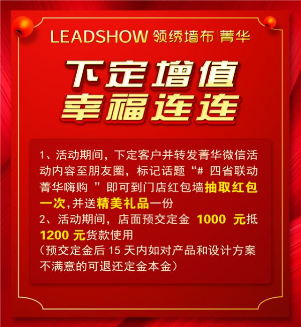 1.活动期间,下定客户并转发菁华微信活动内容至朋友圈,标记话题“#四省联动 菁华嗨购”即可到门店红包墙抽取红包一次,并送精美礼品一份