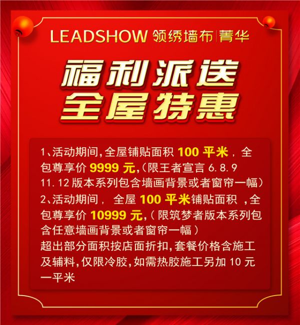 1.活动期间,全屋铺贴面积100平米,全包尊享价9999元(限王者宣言6、8、9、11、12版本系列包含墙画背景或者窗帘一幅)