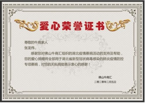 作为佛山牛商会的执行会长,伊盾门窗董事长张龙伟先生身先力行,从新年开始就一直积极奔走,号召牛商汇的企业家们为湖北人民捐款献爱心。仅仅三天时间,佛山牛商汇便筹集一笔巨款捐给武汉十字会。