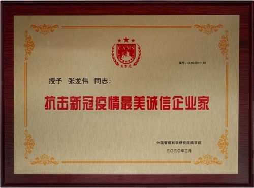 2020年4月8日,伊盾门窗董事长张龙伟先生被中国管理科学研究院商学院授予“抗击新冠疫情最美诚信企业家”荣誉称号。