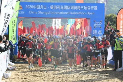 2020中国舟山·嵊泗列岛国际划骑跑三项公开赛继续第一届成功运作的分组模式,将赛事分为划骑跑三项公开组、划骑跑三项分龄组、桨板和皮划艇组,参加三项赛的运动员需在5小时内先后完成8km皮划艇(绕行2.5圈),45km山地车(骑行3圈),10km越野跑共计63km赛程。今年比赛共吸引了近500名中外选手参赛,其中男、女三项公开组参赛人数达到100人,报名选手中包括了彭剑辉、巴特孟开、杨苏林、唐景燕、陈小兰、蒋冬梅等三项赛强手。